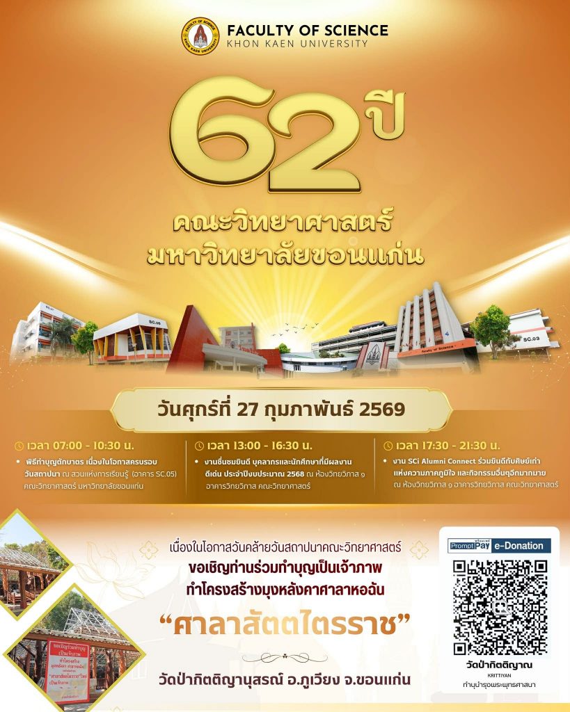 ขอเรียนเชิญผู้บริหาร คณาจารย์ บุคลากร ศิษย์เก่า นักศึกษา ร่วมพิธีทำบุญตักบาตรและกิจกรรมเนื่องในวันคล้ายวันสถาปนา ครบรอบ 62 ปี คณะวิทยาศาสตร์ มหาวิทยาลัยขอนแก่น ในวัศุกร์ที่ 27 กุมภาพันธ์ 2569