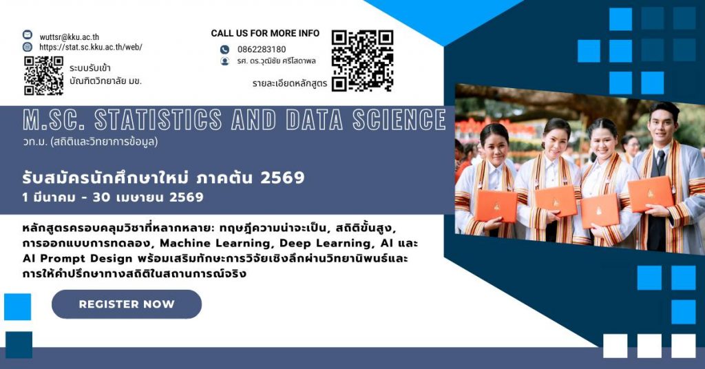 ดูรายละเอียดหลักสูตรเพิ่มเติม: https://stat.sc.kku.ac.th/web/?page_id=1857